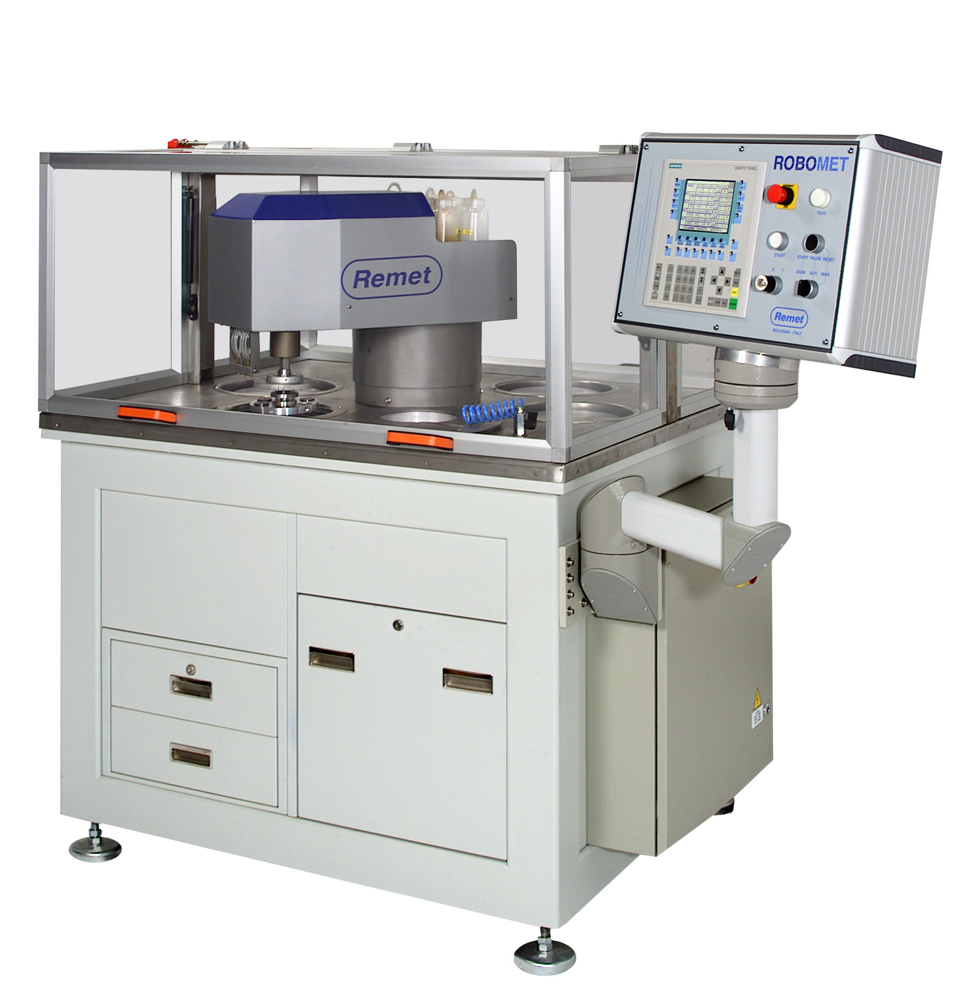 Роботизированный металлографический комплекс - компьютеризированный шлифовально-полировальный станок предназначен для полностью автоматической обработки большого количества металлографических образцов. ROBOMET включает в себя 5 станций с дисками 200 мм и станцию очистки и сушки. Станок изготовлен из высококачественных материалов и оснащен системой поглощения вибраций.