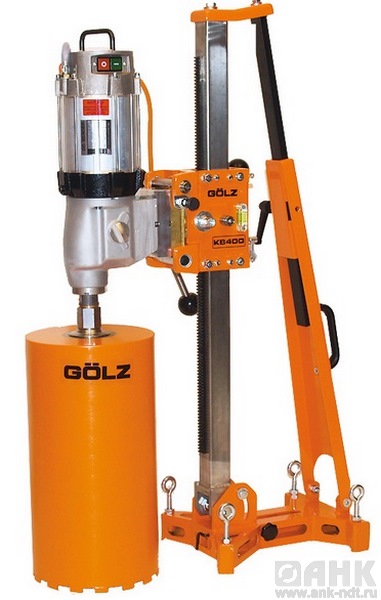 Установка алмазного бурения Goelz КВ-400 рассчитана на бурение бетона, армированного бетона, природного и синтетического камня, асфальта, алмазными колонковыми бурами с подачей воды для отверстий диаметром от 50 до 400 мм.