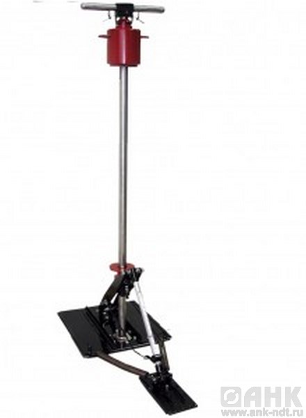 Принцип действия измерителя основан на определении величины горизонтального перемещения по увлажненному покрытию башмака-имитатора автомобильной шины, прижимаемого к покрытию под углом 45°. В качестве источника для прижима и перемещения башмака-имитатора используется кинетическая энергия определенной массы груза свободно падающего по вертикальной штанге с определенной высоты. Величина горизонтального перемещения прижимаемого к увлажненному покрытию башмака-имитатора зависит от коэффициента сцепления, в долях которого проградуирована отсчетная шкала прибора.
